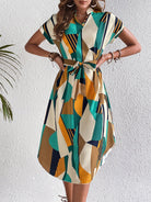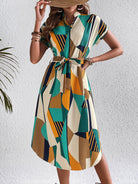 This abstract art dress combines creativity and sophistication, featuring a tied belt for an adjustable fit and a stylish hemline cut. Its unique design and flattering silhouette make it the perfect choice for making a bold statement while staying comfortable.