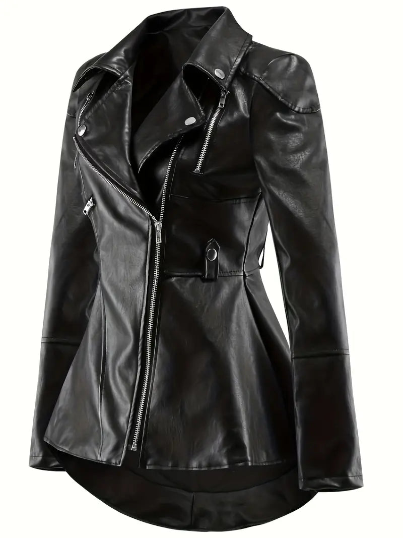 This asymmetric zipper vegan leather jacket combines bold fashion with cruelty-free craftsmanship. The sleek vegan leather exterior offers a smooth, polished finish, while the asymmetric zipper adds a contemporary edge. A tailored fit enhances your silhouette, making it a stylish choice for layering over casual and dressy outfits. Ideal for nights out, urban streetwear, or adding a rebellious touch to any look.