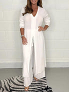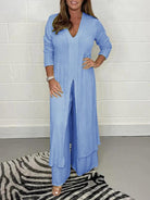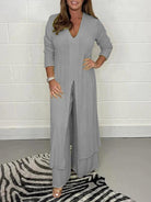 This long-sleeved V-neck top paired with matching wide-leg pants offers a chic, modern look with a relaxed fit. The V-neckline and unique center-front slit add a touch of elegance, while the wide-leg pants with layered folds provide a flattering, flowing silhouette. Perfect for both casual and semi-formal occasions, this set ensures comfort without compromising on style.