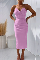 This midi-length dress is the perfect blend of sophistication and structure. Featuring a fitted bodice with a deep V-neckline, accented by vertical pleated folds, the design flows into a structured skirt, creating an elegant and flattering silhouette. Ideal for formal events, it exudes refined style with a modern twist.
