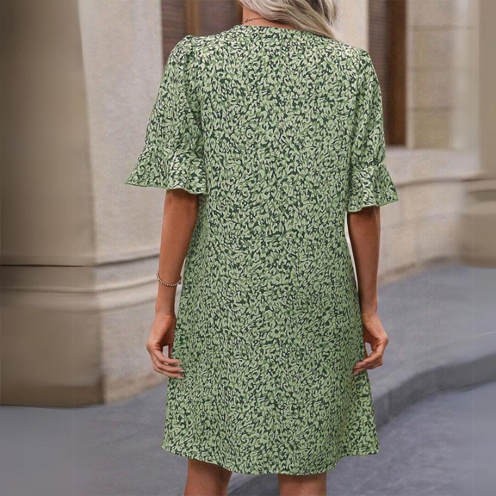 This elegant V-neck dress combines a bold, vibrant print with a comfortable, high-quality fabric that ensures a stylish and relaxed fit. Featuring short sleeves and a flattering V-neckline, it effortlessly adds color and vibrancy to your wardrobe. Perfect for both casual and dressier events, it blends comfort with eye-catching style.
