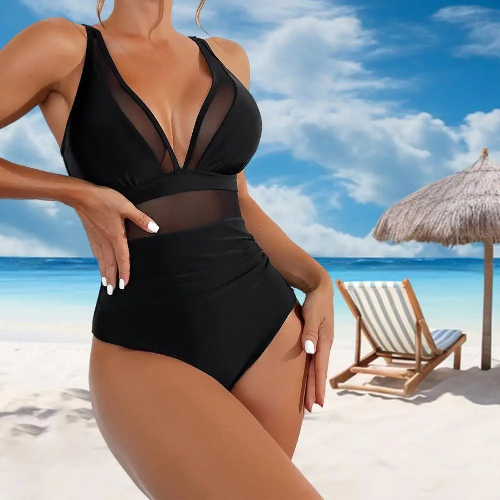 Step into effortless sophistication with this one-piece swimsuit designed for modern women. Featuring a deep V-neckline with sheer mesh panels and a flattering high-waisted style, it combines bold design with a comfortable fit. Perfect for turning heads at the beach or pool.