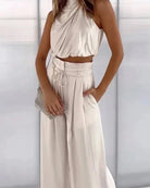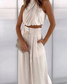 This chic two-piece set effortlessly combines elegance and comfort, offering a perfect balance of style and sophistication. The fitted, cropped, cowl-neck, off-the-shoulder top pairs beautifully with the wide-leg pants, designed with a high waist and a unique belted design. Crafted from smooth fabric that drapes flawlessly, this set is perfect for both casual and dressier occasions.