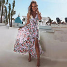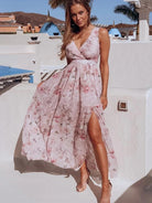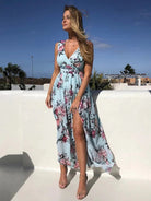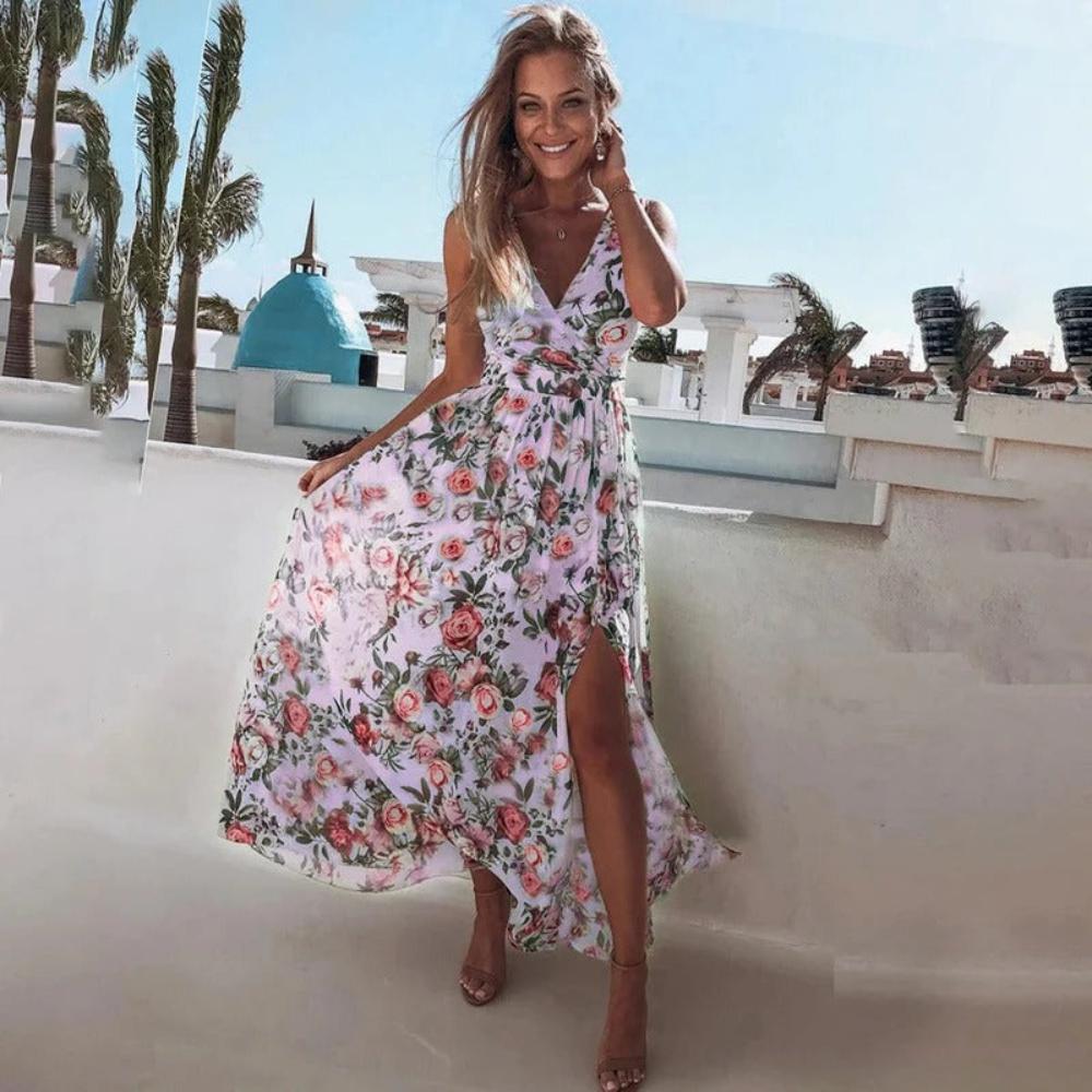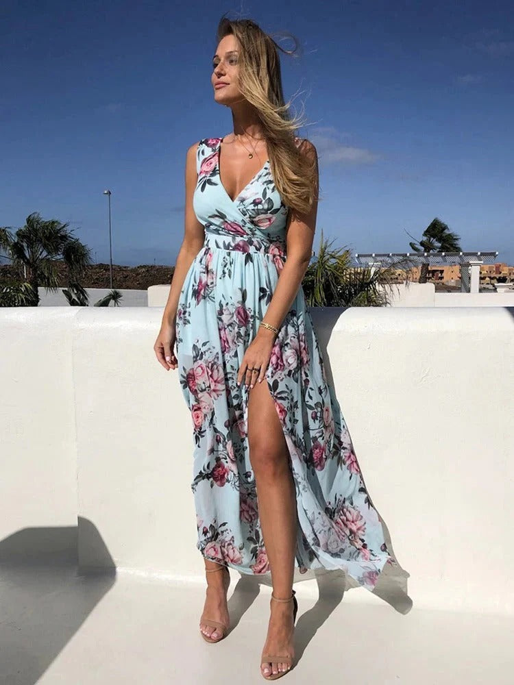 This sleeveless summer maxi dress combines vibrant floral prints with an effortlessly chic design. The draped V-neckline and gathered bodice create a flattering wrap effect, while the relaxed fit and side split ensure comfort and movement. Perfect for embracing warm-weather style with grace and ease.