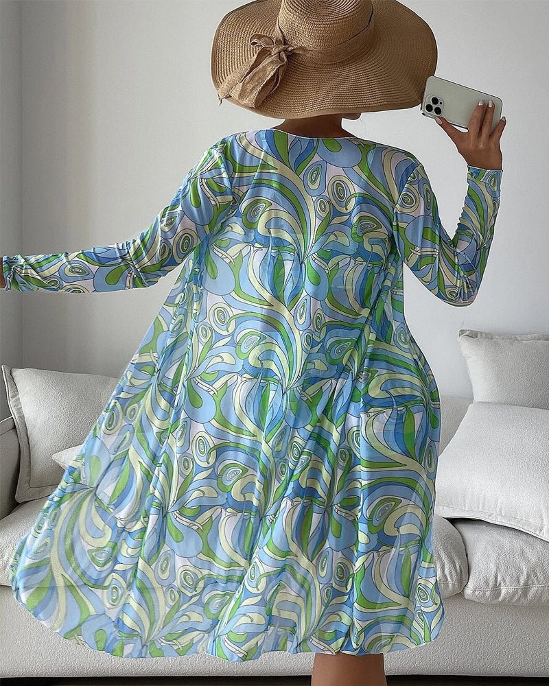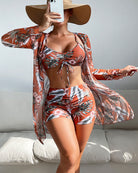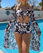 This three-piece swimsuit set features an abstract patterned crop top with a drawstring tie at the neckline, matching shorts, and a long, flowing cover-up. The vibrant design and comfortable fit make it a perfect choice for lounging by the pool or strolling along the beach.