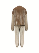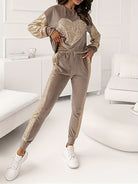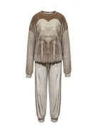 This women’s sweater and pants set features a heart design and an adjustable drawstring. The set includes a long-sleeve sweater and matching pants, suitable for various indoor and outdoor activities. Designed for all seasons, it provides coverage and adaptability for different weather conditions.