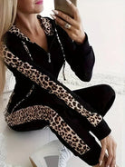 This women’s tracksuit features an leopard print and includes a matching top and bottoms. The fabric is suitable for all seasons, offering a balance of coverage and breathability. Designed for casual wear, it provides a coordinated look for indoor and outdoor settings.