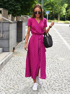 This stunning wrap dress combines femininity and sophistication, designed with a flattering wrap style and a waist tie for a customized fit. The short sleeves and thigh-high slit add a touch of allure, while the floral pattern brings a refreshing, vibrant feel to your wardrobe. Perfect for both casual and dressy occasions, this dress offers effortless style and comfort.